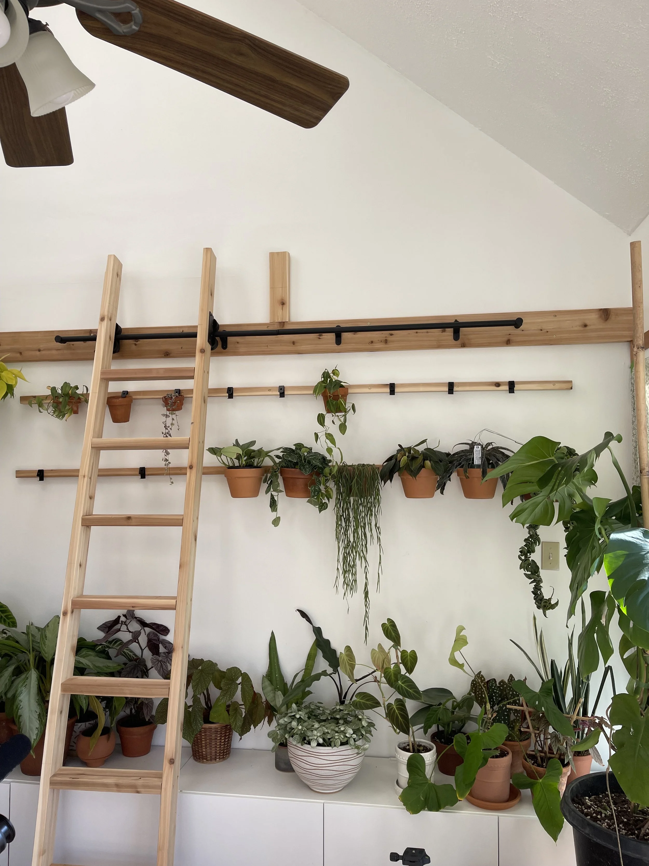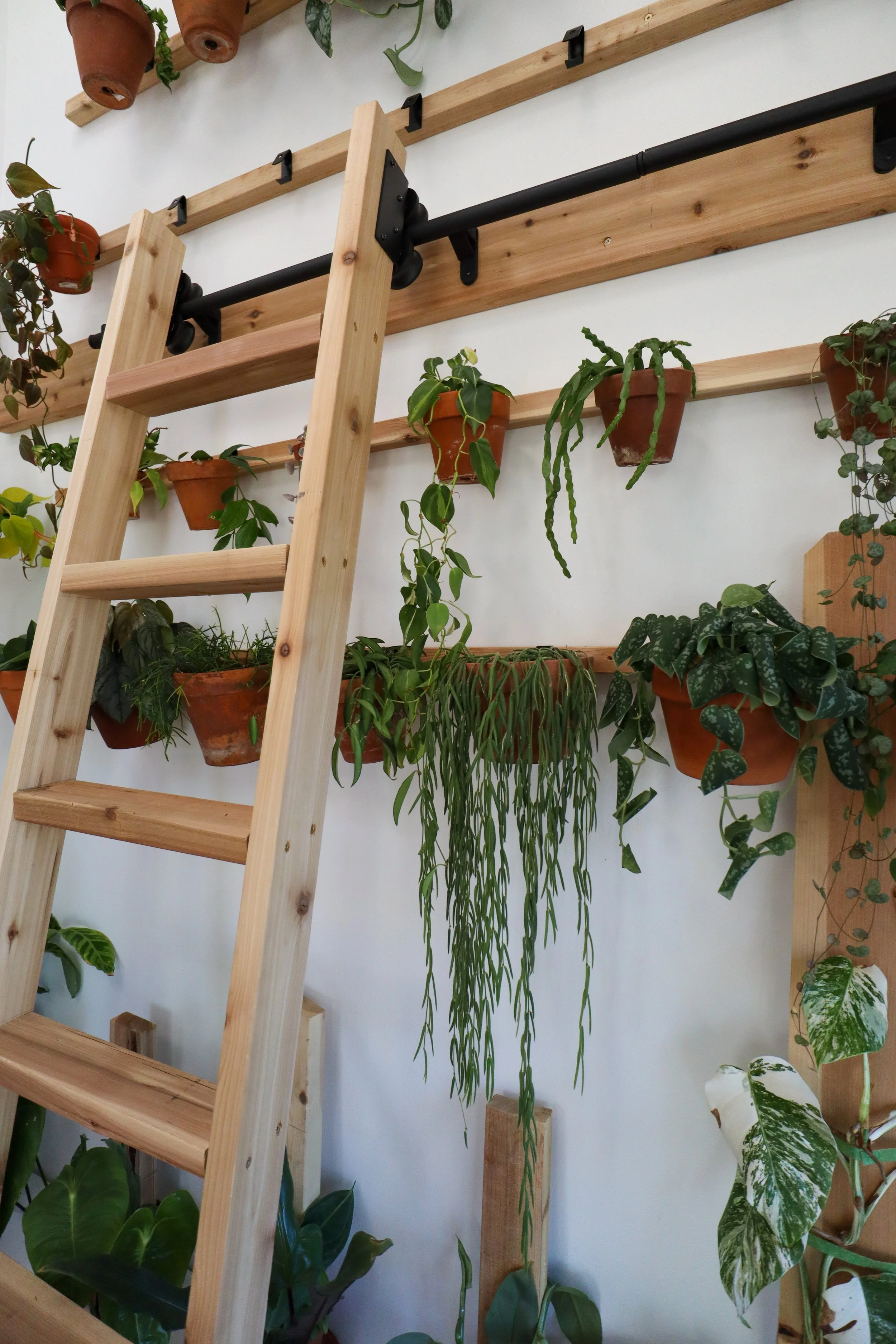 This space was my very first large-scale plant installation. From the ladder to the wall hanging apparatus, I built it all with my own two hands. This project was a great introduction to creating large-scale plant displays and is still, to this day, one of my favorites.